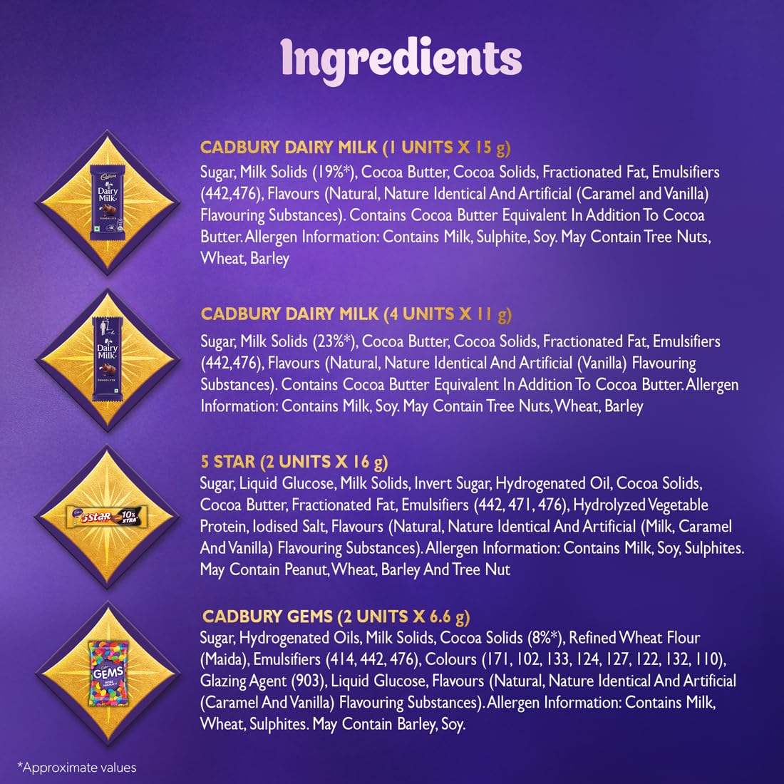 Brand Cadbury Item Form Bar Occasion Diwali Chocolate Type Milk Flavour Chocolate Net Quantity 179.6 gram Diet Type Vegetarian Speciality... Read more